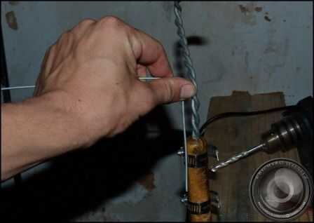 (Tercera foto) Enrolle el alambre hacia abajo el gancho en la misma dirección que el gancho sí mismo fue atornillado en el eje. En este caso, me torcí el gancho en la izquierda, por lo que el alambre fino también debe enrollarse hacia la izquierda. Hacerlo en sentido contrario se traducirá en el gancho atornillado en el eje otra vez.