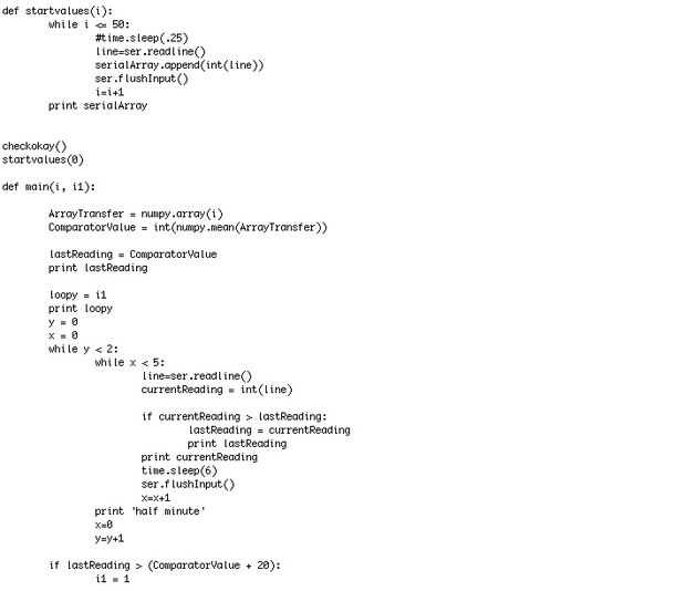 #!/usr/bin/python #Filename: TwitterChair.pyimport twitterimport serialimport numpyimport timeimport random## Your username and password here#api = twitter.Api(username='yourusername', password='yourpassword')## Change this to match your serial port#ser = serial.Serial('/dev/tty.usbserial-A70063pF', 19200)serialArray = []global gassygassy = 0def checkokay(): ser.flushInput() time.sleep(3) line=ser.readline() time.sleep(3) if line == ' ': line=ser.readline() print 'here'def startvalues(i): while i <= 50: #time.sleep(.25) line=ser.readline() serialArray.append(int(line)) ser.flushInput() i=i+1 print serialArraycheckokay()startvalues(0)def main(i, i1): ArrayTransfer = numpy.array(i) ComparatorValue = int(numpy.mean(ArrayTransfer)) print ComparatorValue lastReading = ComparatorValue print lastReading loopy = i1 print loopy y = 0 x = 0 while y < 10: while x < 5: line=ser.readline() currentReading = int(line) if currentReading > lastReading: lastReading = currentReading print lastReading print currentReading time.sleep(6) ser.flushInput() x=x+1 print 'half minute' x=0 y=y+1 if lastReading > (ComparatorValue + 50): i1 = 1 if i1 == 1: sayings = ["He farted again with success and vigor. Woest me.", "Pfffffffffft", "Ugh. That was a gross one", "Someone please disassemble me", "If I could puke my foam stuffing, I would", "I wish I were some other chair", "He farted right on me again", "Didn't hear that coming", "allow me to repeat... ppppfffffffffftttttttttttt", "It wasn't always like this."] pickSaying = random.randint(0,9) print pickSaying status = api.PostUpdate(sayings[pickSaying]) loopy = 0 print 'done' if __name__ == "__main__": main(serialArray, loopy)main(serialArray, gassy)