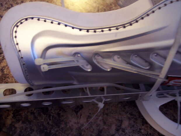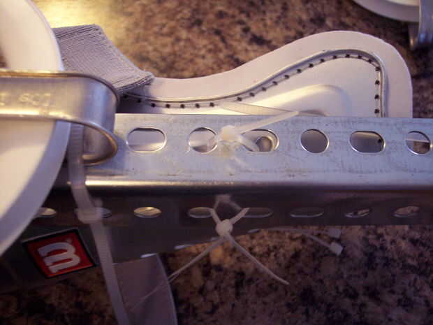 Fije el soporte a los largueros del bastidor poniendo ataduras de cremallera a través de los orificios de ventilación en la sección de cáscara más dura de las espinilleras y luego a través de los largueros del bastidor para que se realizó bien. Ser paciente, es tedioso y frustrante, pero vale tu amigo poder moverse.