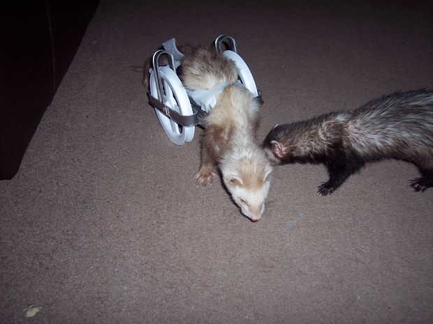 El video es de los primeros pasos de Merlin. Él se lleva muy bien, aunque todavía es muy débil, por lo que no se queda fuera durante mucho tiempo. Todavía intenta utilizar sus patas traseras, por lo que les dejamos sin soporte. Si su animal está paralizado o hay alguna otra razón, puede que desee cortar los largueros del bastidor más largos para dar un lugar para apoyar las piernas, o incluso añadir extras ruedas (ruedas capaz de turno) frente o detrás para soportar el peso extra.