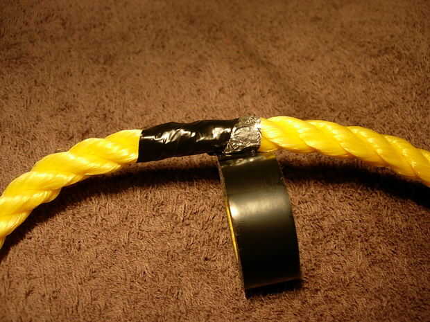 6. Tome la cinta y papel apagado. Como veis, la lámina impide que la cinta aislante cuando se aplica calor de fusión a la cuerda.