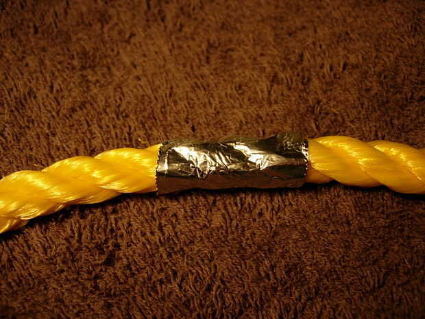 1. cortar un trozo de papel de aluminio sobre una pulgada (2,5 cm) de ancho y un par de pulgadas de largo (5 cm), suficiente para envolver alrededor de la cuerda una vez o dos veces (cuadro 1).