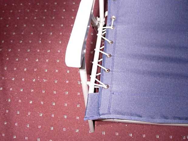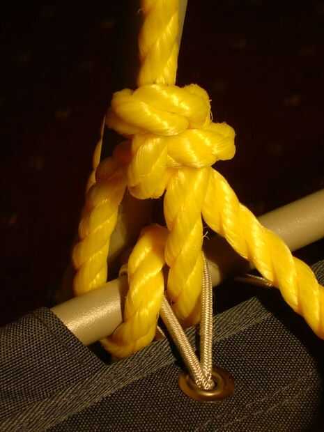 El mejor lugar para atar la cuerda a la silla es la varilla de conexión del asiento a los lados. (ver segunda foto). Debe haber un lugar similar en la mayoría de las otras sillas de jardín. Este lugar proporciona estabilidad y sostiene el peso en una punto de carga.