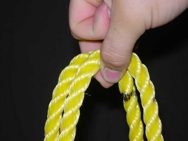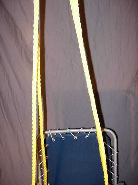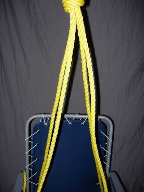 Cuando dos cuerdas están incluso, levantar la silla entera en el verdadero punto medio. La silla debe levantar uniformemente, las 4 esquinas a la vez. Si no lo hace, luego ajustar en consecuencia (mediante el ajuste de la parte posterior izquierdo nudo). Lo hace no necesita ser perfectamente incluso (y nunca lo será) pero debe estar relativamente cerca.