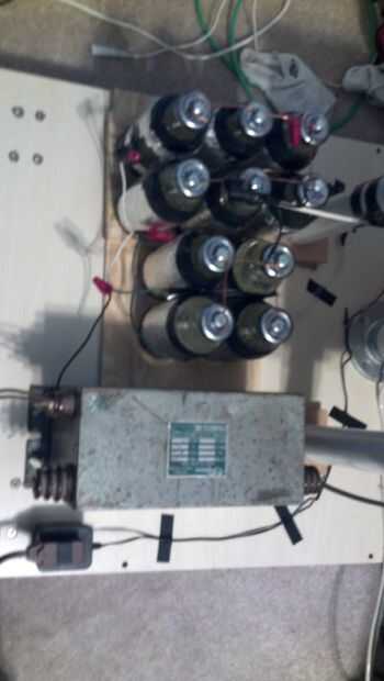8. Conecte los lados de los condensadores a la parte inferior de la bobina primaria, a través del agujero en el escudo para este propósito. Tenga cuidado alrededor del lugar donde el secundario se conecta al cable de tierra. Es mejor envolver este y esa conexión en como cinta eléctrica tanto como sea posible. Se puede arco 3 o más pulgadas si no correctamente aislado.
