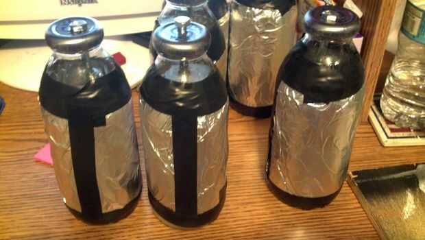 Para construir los condensadores de agua salada, también llamados "Jarras de Leyden", necesita 6-10 envases de vidrio de Snapple vacíos, un puñado de sal de mesa, agua, aceite de canola, un montón de papel de aluminio, un montón de cinta eléctrica y algunos viejos regular 120v interior 20amp cobre alambre (lo que viene en manga blanca con tres alambres solo sólidos dentro). El número de botellas dependerá de su transformador, cada botella trata de 4µF según otra bobina de Tesla instructable que parece que no puedo encontrar. Según el comentario de Glen781 en la bobina de Tesla de DevCoder instructable, si usas un transformador de 15000V, como soy yo, 6 condensadores de botella soplará para arriba! Usar más! Utiliza 10 y no han tenido ningún problema. Cuanto mayor sea la tensión, los condensadores más necesita. Como se puede ver en las fotos, usé tornillos en vez de alambre de cobre en las botellas. Esto no funciona muy bien como los pernos oxidados. Ya he sustituido los con el alambre de cobre.