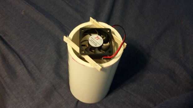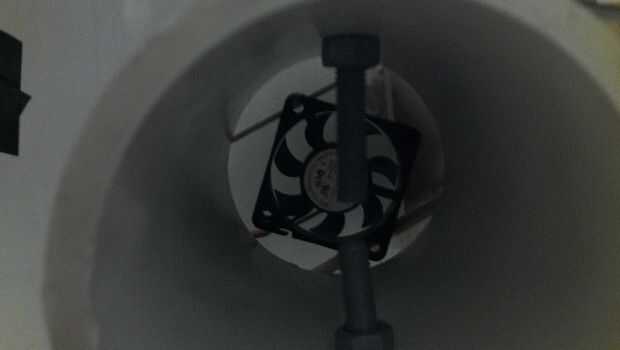 4. Si desea, puede poner un ventilador en un extremo de la tubería, para refrescarse del boquete de chispa. Cuanto mayor sea el ventilador, mejor. Actualmente estoy adjuntando un ventilador de secador de pelo a la mía, como el ventilador de la computadora no fue suficiente para la operación constante. Mina se sobrecalienta después de unos 10 segundos. Algunas personas optan por usar una aspiradora de taller para succionar aire a través de la brecha, pero tendría cuidado como el aire caliente puede derretir la manguera.
