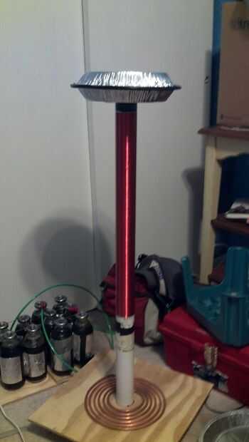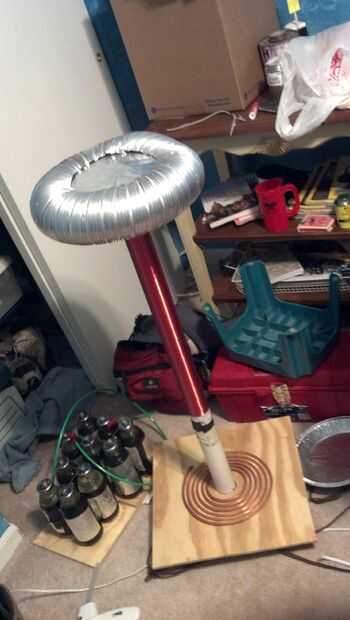 La carga superior, o la forma de buñuelo en la parte superior, actúa como un condensador muy pequeño en el circuito de la bobina secundaria. Usé moldes de pastel y conducto secador de aluminio para hacerla. Yo corté unas cuantas veces mientras cortar el aluminio, así que una vez más, tenga cuidado! Como se puede ver en uno de los cuadros, usé un soplete de butano a soldar las dos partes entre sí. Que era una mala idea porque el calor deforme el aluminio, luego cuando haya enfriado cambiaría a su forma original, y la soldadura se rompa. Descubrí que no necesitaba ningún pegamento para mantener Unidas.