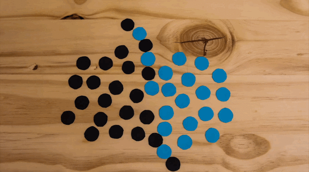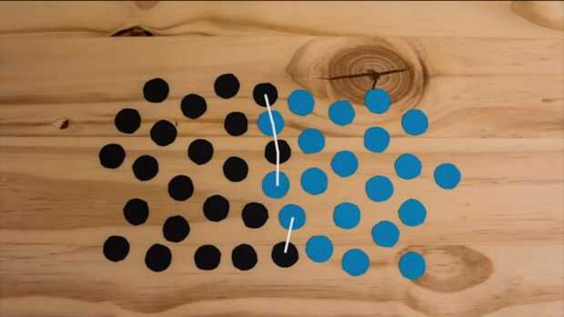 El truco de la cuerda es una forma inteligente con graves diferencias en las cantidades iniciales de los dos monómeros, A y B. Eso es porque en todo momento, hay sólo un lugar para una reacción que se produzca, en una interfaz de 2-D, y por lo tanto, se eliminan oportunidades de terminación anticipada por la abundancia de cada molécula.