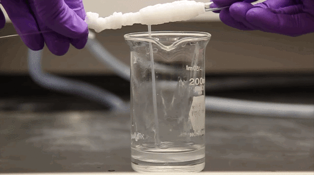 En cuanto a las formas de la barrera de polímero, ninguna otra reacción ocurre como los dos reactantes están separados físicamente. Ahora para el truco de la cuerda. Usando pinzas o una varilla de vidrio o prácticamente nada poke-y podemos agarrar el polímero en la interfaz y sacarlo de la solución. Como lo hacemos, los dos líquidos se permiten una vez más para conocer y empezar a añadir a las cadenas que ya hemos creado dentro de la capa que estamos extrayendo. Si envolvemos el polímero alrededor de un varilla de vidrio y comienza a girar, nos podemos salir de nylon nuestras soluciones indefinidamente, hasta que uno o ambos de los reactivos se agotan.