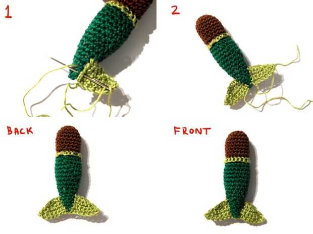 Mirar en la foto de las vistas de la parte trasera y delantera. Usted podría no notar una diferencia en las fotos, pero las aletas tienen una conexión más plana en la vista posterior y más redonda de conexión en la vista frontal. Ahora, esto puede todo depende de a qué distancia colocar las aletas, o cómo llevo a cabo la pieza mientras se cose, pero lado enfrenta me termina para arriba con una apariencia más plana. Prefiero el look más redondo de la parte delantera de la sirena. Si prefiere el mismo, asegúrese de sostener la pieza con la parte trasera de la sirena frente a usted mientras que usted coloque las aletas.