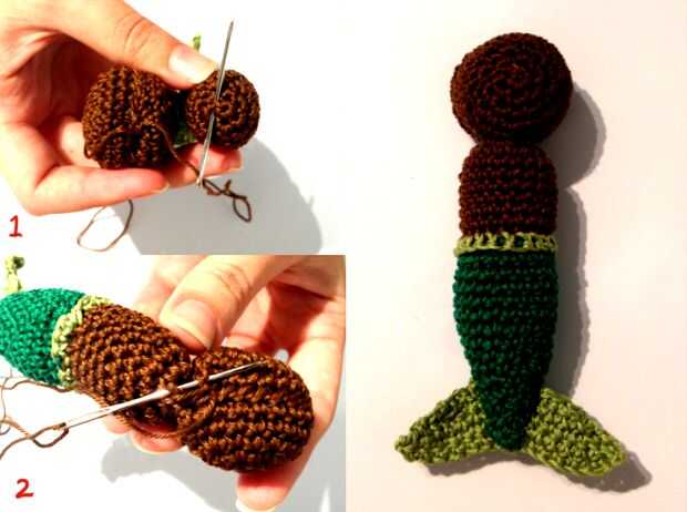 2. cosido alrededor de las primeras y segunda rondas de mensajes, para hacer una conexión más estable y más grueso "cuello". Al coser la cabeza al cuerpo, asegúrese de que los lados de la cabeza se encuentran en la misma dirección de las aletas. La superficie redonda más grande debe hacer frente el frente de la pieza.