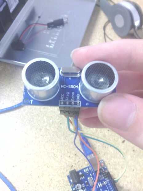 Trig y eco puede ser cualquier dos colores. Hombre conectado al Trig va a 12 Digital en Arduino(see code). Hombre conectado a Echo va a 13 Digital en Arduino(see code)
