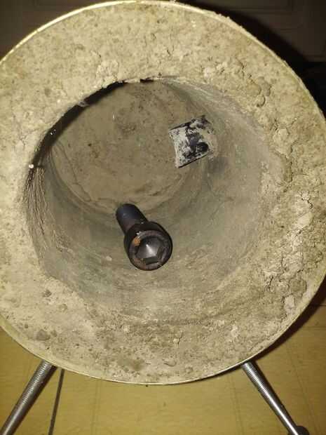 Asegúrese de que el molde esté completamente seco, el concreto esté completamente seco y entonces usted está listo para comenzar a calentar y hacer su metal. Tengo un perno hexagonal de allí como un ejemplo de mi próximo proyecto que será una hoja de un cuchillo de caza o un puñal no he decidido que aún