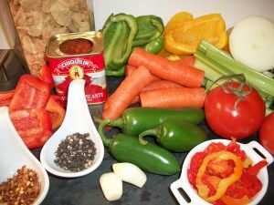 -Cualquier tipo de calientes o picantes pimientos tienen-a su gusto (usé jalapeños, conservado en vinagre pimientas del plátano, secado de granos de pimienta negras machacados, pimentón y secado de hojuelas de pimiento rojo-se llama pimentero sopa después de todo).