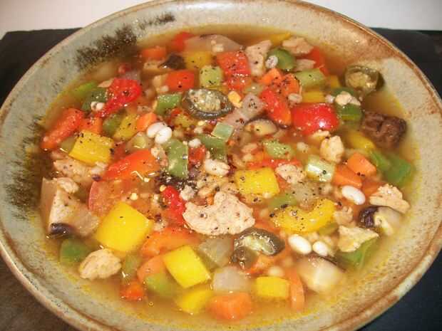 -Mientras tanto, cortar las verduras de raíz, ajo y pimientos frescos (usted puede hacer esto mientras están tomando los shiitakes y chik'n). Ablandar en una sartén con un poco de aceite vegetal y añadir a la crockpot.