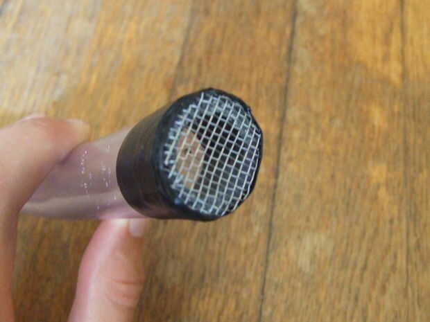 Esto es para evitar todo tipo de basura desagradable de conseguir aspirado encima de la tubería y en el arma. Sólo cortar un círculo con las pestañas de un parche de ventana pantalla, doble las lengüetas de espalda y eléctricas cinta adhesiva en el extremo de la tubería como se muestra. En este momento, estamos listos.