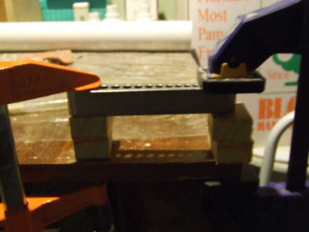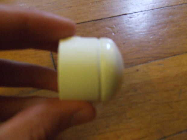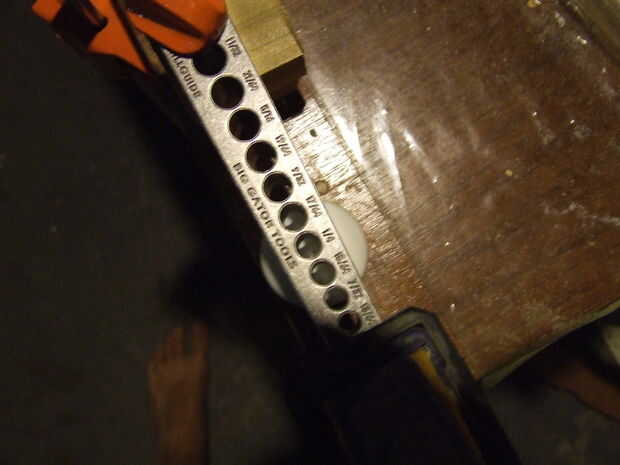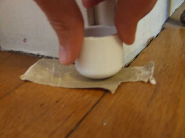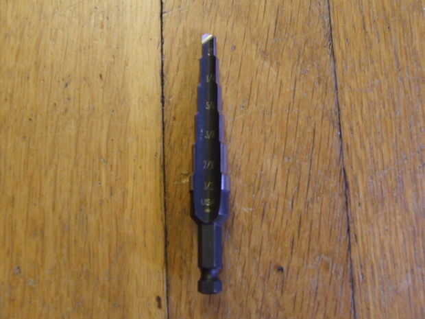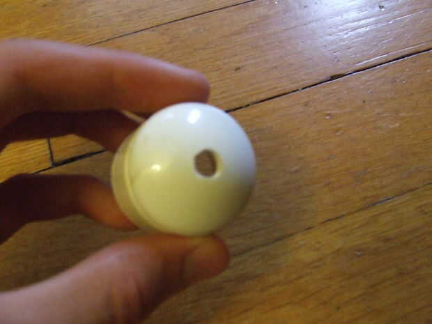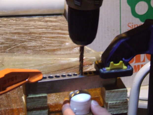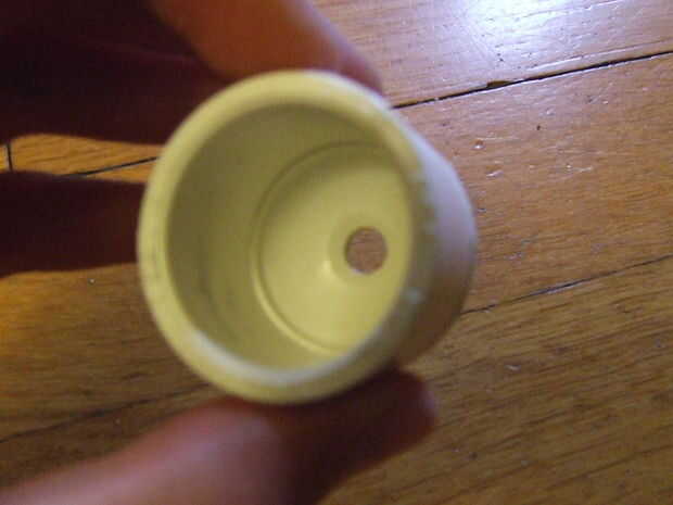 La tapa del extremo se convierte ahora en la boquilla. Para marcar el centro de la tapa: colocar un papel de lija en la parte inferior de un marco de puerta, sostenga la tapa y el papel de lija contra el marco de la puerta como se muestra y girar ligeramente para marcar un punto en él, luego use un punzón para marcar el centro de la. Ahora quieren un agujero con bordes limpiar 5/16" a través de él. Un Unibit es lo mejor para esto. Se puede utilizar un taladro, o mi taladro junto bodged sustituir el diseño que utiliza a una guía de taladro de V (http://tapguide.com). Oh y si se utiliza una broca de taladro de torcedura regular, con un tamaño pequeño, ya que son menos propensos a coger.