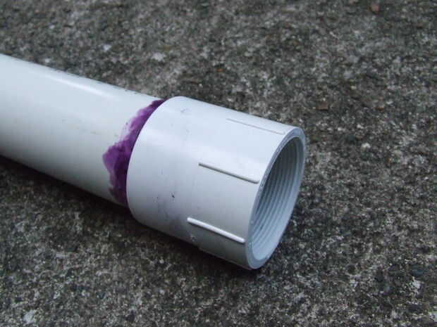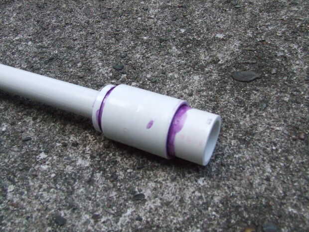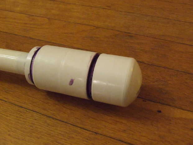 Ahora en el pistón: cemento la t de 3/4" en la barra de pistón, luego (y esta es la parte importante) Deslice la tapa de limpieza modificado 2" sobre la varilla del pistón antes de cualquier otra cosa en el extremo de cementación. Ahora de cemento 3/4" a 1-1/4" casquillo en la varilla del pistón, luego el enganche, luego la 2" de 1-1/4" tubo y luego el casquillo de extremo, dejando una separación de 3/16 de pulgada entre el acoplador y el casquillo de extremo. Una barra de metal de 3/16" puede ayudar con esto. Encuentra todo para curar durante la noche.