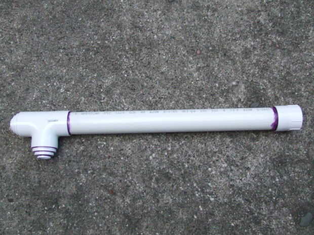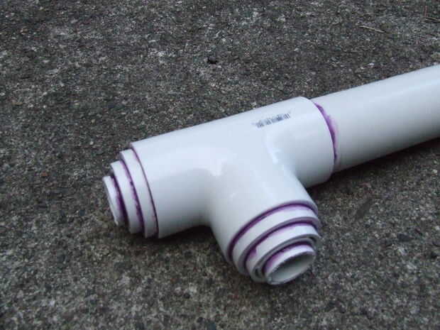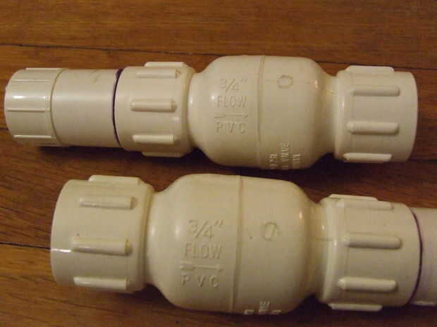 Cemento la t de 2" en un extremo del cilindro y el adaptador de 2" roscadas en el otro, luego el 2" a 3/4 bujes en el tee, y un conector de 3/4" tubo de los bujes. Las válvulas de retención en lugar de cemento ahora, y no, que no te perdono si hacia atrás en cemento. Hay una flecha en cada válvula para que sea más fácil. El siguiente es otro conectador del tubo en cada válvula, seguido por la boquilla tapa final en uno y el adaptador de 3/4" roscadas en el otro.