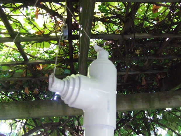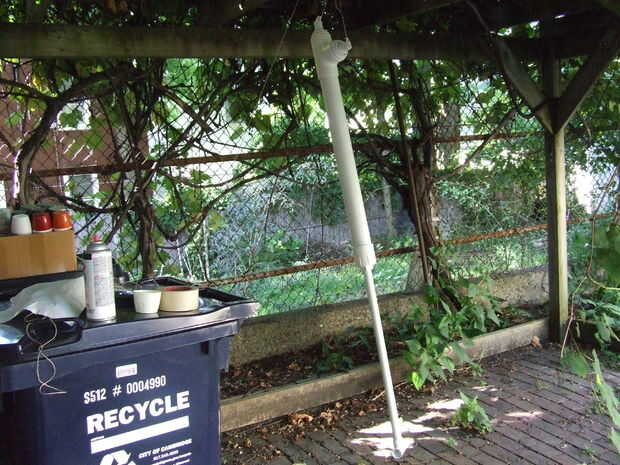 En este punto algunas partes todavía estaban en el correo, así que decidí terminarlo mientras estaba todavía sin terminar. Si utilizar cemento claro y hacer limpias juntas sólo puede quitar las marcas de fábrica con acetona. Desde que uso primer púrpura, decidí pulverizar la pintura. Pintura Krylon Fusion se adhiere bien al PVC sin cartilla, sólo un rápido lijado con lija de grano 320. En la foto puedes ver cómo colgado el cuerpo con guita, entonces enmascarado de los extremos de los tubos del conector. Varias capas de pintura deben cubrir primer púrpura y las marcas de fábrica.