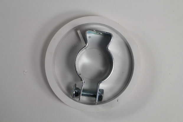 Alinee su suspensión del conducto en el centro de la tapa como se muestra. Tapas varían, así que usted puede necesitar recortar la pestaña para obtener la suspensión centrada. lado debe descansar contra la ficha.