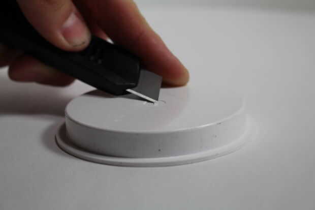 Tomar su segundo casquillo de nocaut y localizar su centro. Usando un cuchillo, retire el tope plástico.