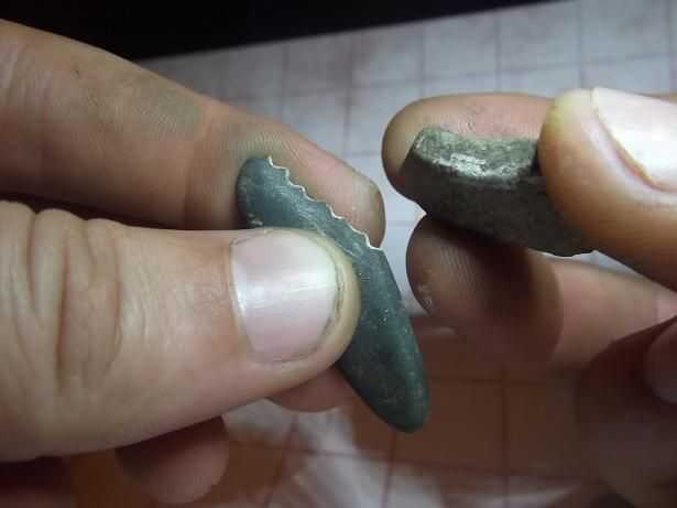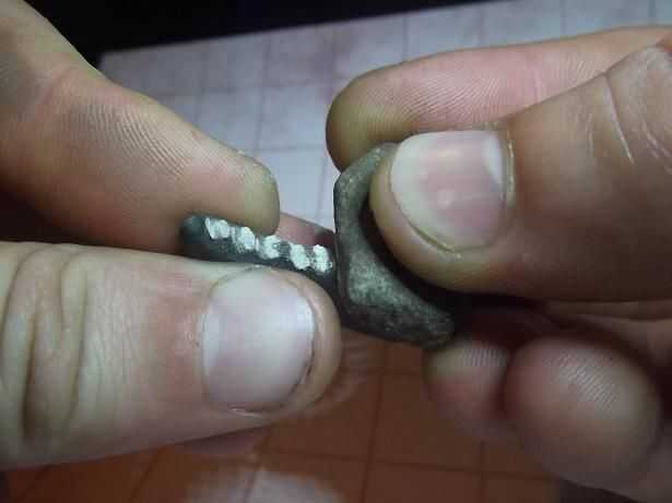En este paso, decidido que borde para mi dientes de sierra y comenzó a moler y hacia atrás con el borde afilado de la otra roca para hacer los surcos. Detalle más fino, más tiempo y una roca más aguda, más fina dará como resultado dientes más agudos en la sierra final. Si después de algunos más borde a la roca, puede moler los lados de los dientes hacia abajo en un ángulo. Para ello, utilice una superficie de roca lisa y moler en un movimiento como si están usando un bloque de afilar para una cocina / caza cuchillo para darle un borde fino. Deberás acabar con los dientes corriendo por un borde