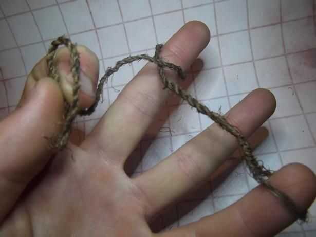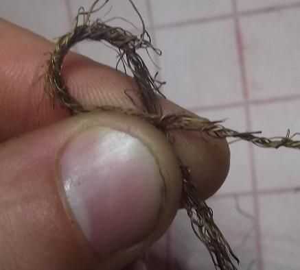 Ahora esta es la parte donde tienes que observar cuidadosamente el ' ible sobre cómo hacer la cuerda de la hierba y hazte una longitud de cuerda de unos 30cm de largo. Una cosa que debo mencionar aquí y es decir, cuando empiezas, doblar la longitud de la hilada 'guita' por la mitad, hacer un lazo cerca de 1.5" de tamaño y empezar a hacer la cuerda de esta sección. Ver la imagen para entender como esto es difícil de explicar.