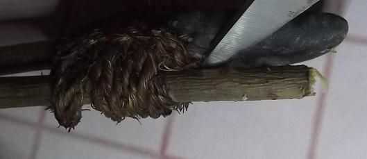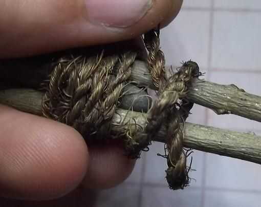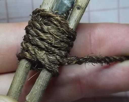 Terminar el lazo con un enganche de medio y meter la cuerda en el lado del mango del palo y roca con algo puntiagudo. (Yo usé las tijeras)