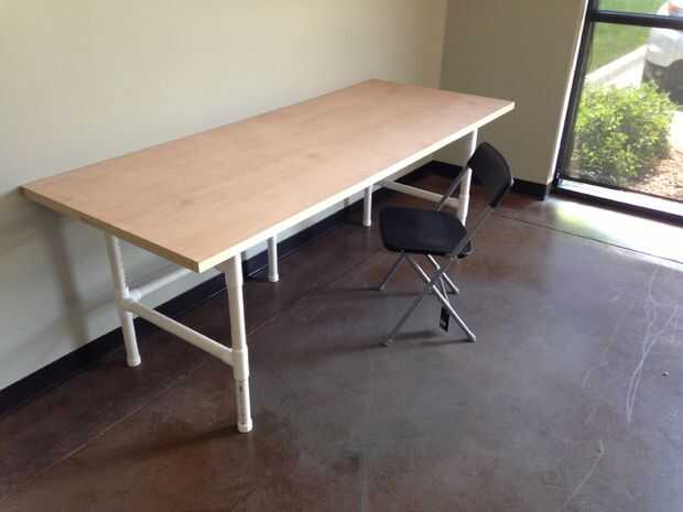 Como el título indica, este Instructable le mostrará cómo construir una muy gran mesa fuera una puerta hueca y tubería de PVC y accesorios. Puede ser utilizados para cualquier cosa, como arte, tren de mesas, mesas de luz o para ventas de garaje o incluso familias cenas como una 'tabla de los cabritos'. Es totalmente hasta usted. Diez de ellos necesitamos y utilizamos como escritorio. Esta fue nuestra primera que hemos construido.