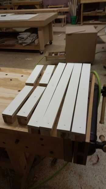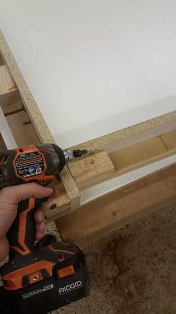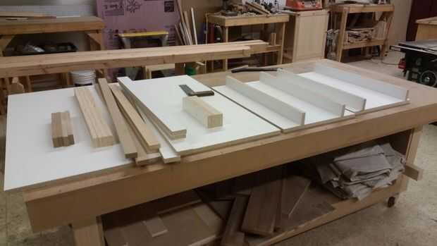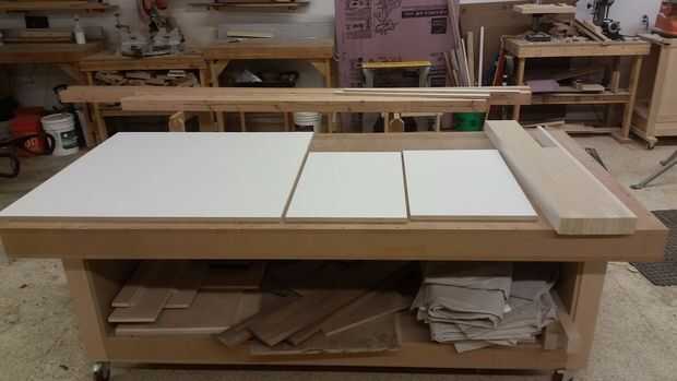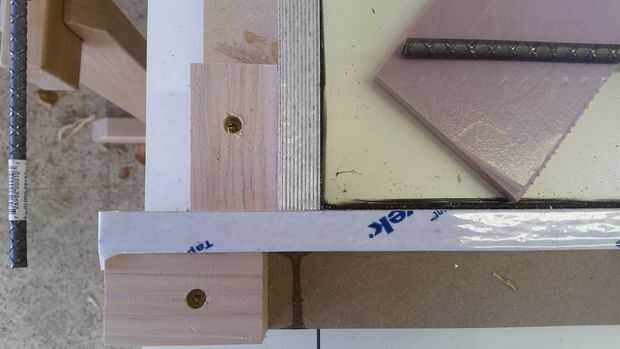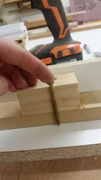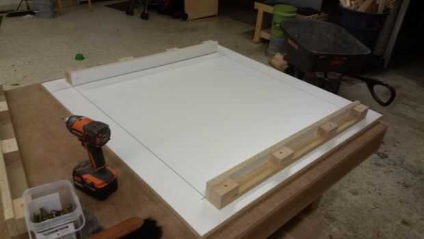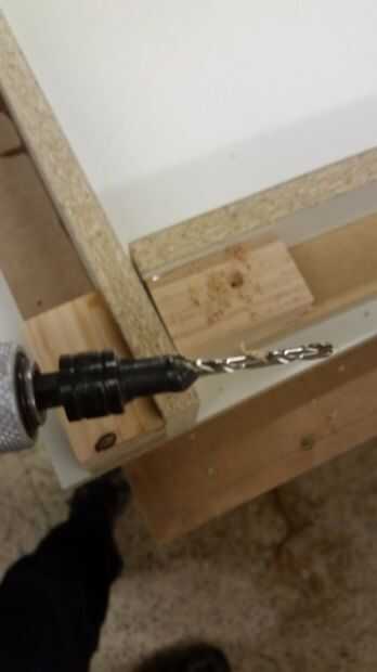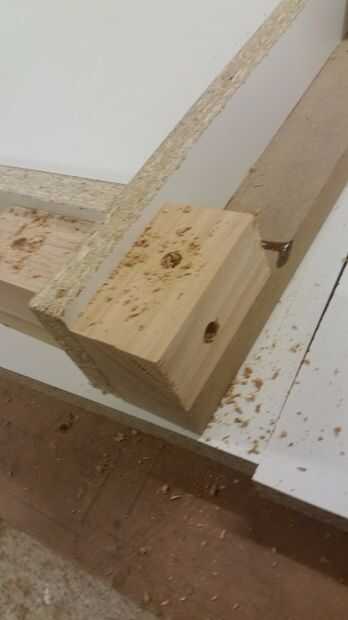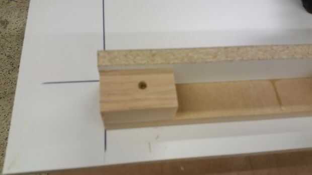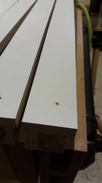 Hice todos los bordes con la melamina y madera contrachapada varios desechos que tuve poner alrededor, formando un soporte "L", con piezas de pino para tornillo y pegamento forro. Pegamento no normalmente pega bien la melamina, usé epoxi (que sólo se pega un poco con algunos maltratados melamina). Para poder extra usé algunos clavos ajuste para mantenerlo en su lugar mientras el epoxi configurar. Configurar los bloques de cada tan a menudo, siempre con uno en el inicio y el final de la pieza, así que podía atornillar lo apoya. También inmediatamente llena los orificios cabeza acabado epoxi, luego utiliza un raspador de tarjeta al día siguiente para limpiar hasta la melamina. Este tanto mantiene la superficie impermeable, así como lisa.
