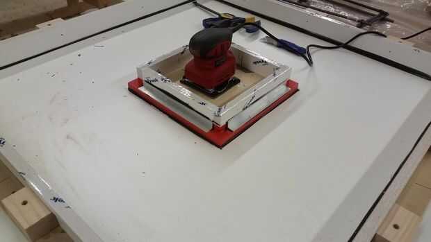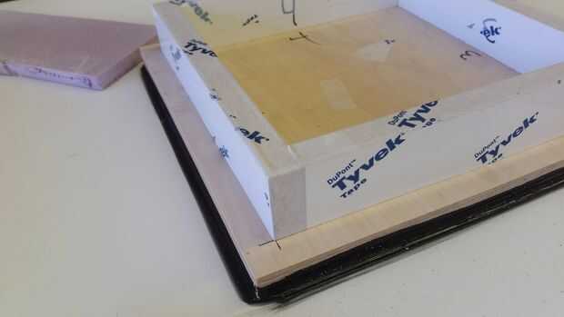 También hice un nocaut en el centro, que era justo un 12 "x 12" pieza de madera contrachapada, con un pequeño marco atornillado a él para un espesor final de 2.5" a quedar al ras con los bordes exteriores. Es muy útil si tienen la misma altura así que usted puede fácilmente más tarde subbase de hormigón mojado. Entonces utilicé aire sellado cinta (material tyvek y algunas cosas de contrapiso) a los bordes de madera contrachapada de sello expuesto. Si sin sellar, absorberá la humedad, se hinchan, y tampoco arruinar su concreto, eliminar la capacidad de volver a utilizar las formas, o ambos.