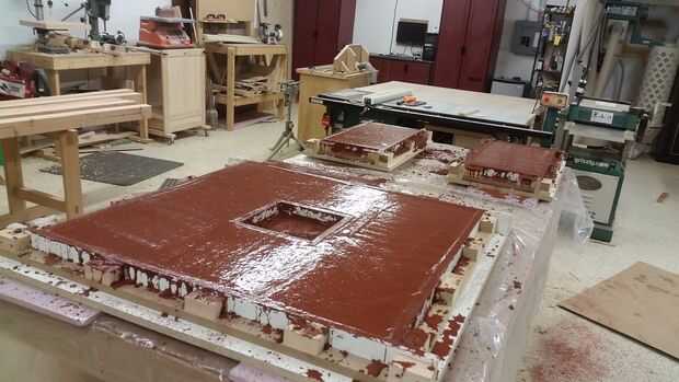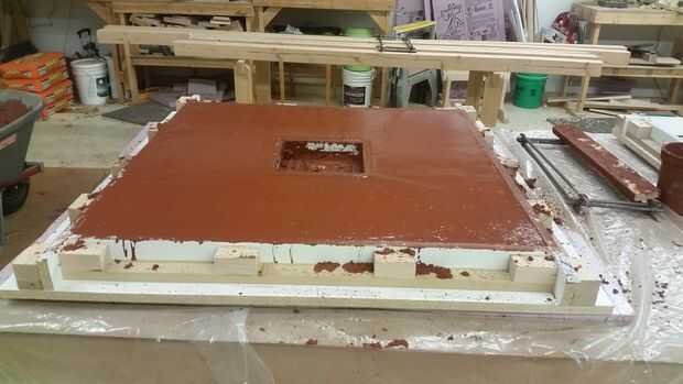 De clave para mí, mezclar bien, verter en 1/2 concreto, coloque la varilla en su lugar, coloque el resto del hormigón, utiliza un vibrador para conseguir todo lo que se establecieron y quitar burbujas de aire, screed y llana la superficie superior (la parte inferior de la pieza final, ya que estoy echando todo boca abajo).