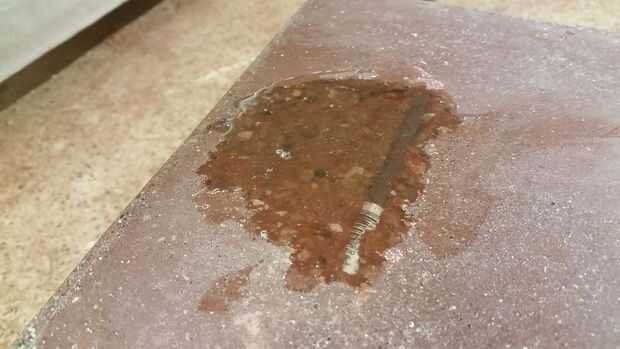 #1 - la cinta tiene polvo de concreto detrás de él y movido lentamente hacia arriba, aumentando mi profundidad de taladro sin mí notando.