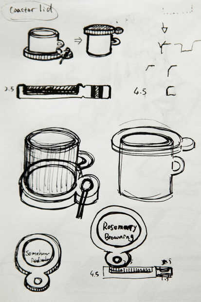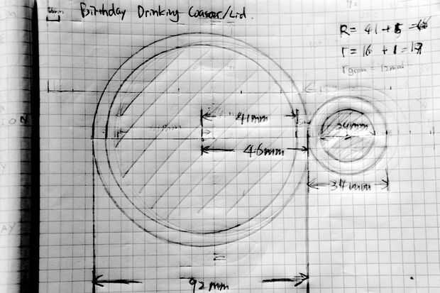 Realizó un dibujo básico del proyecto y las medidas fueron tomadas de una variedad de tazas de café para confirmar dimensiones. El artículo terminado se reduciría de un pedazo de acrílico 9,5 mm de espesor. Cucharas de té también fueron comparadas para posarse sobre un diámetro apropiado para la hendidura de la cuchara.