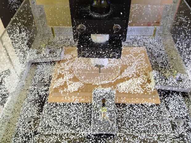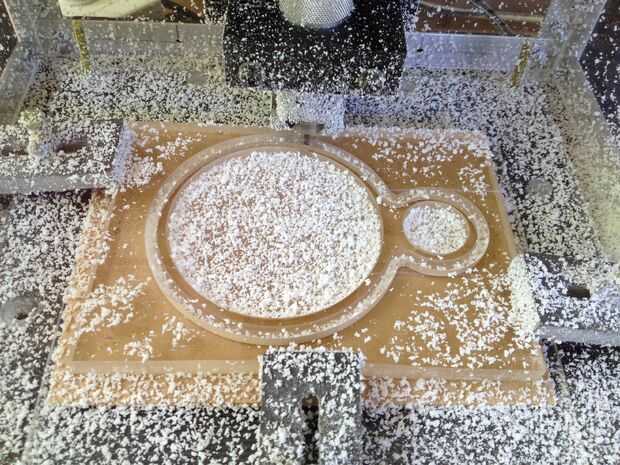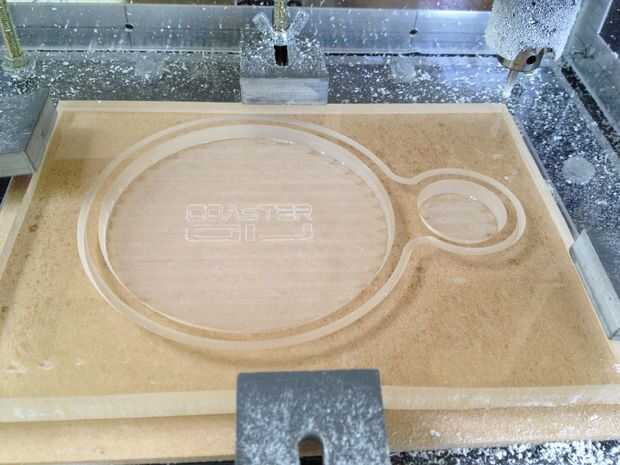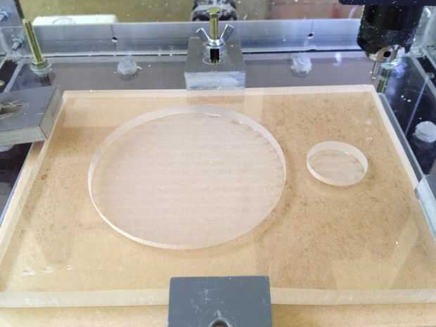 Una pieza de acrílico, las mismas dimensiones del modelo de Artcam es asegurado en su lugar en la máquina.