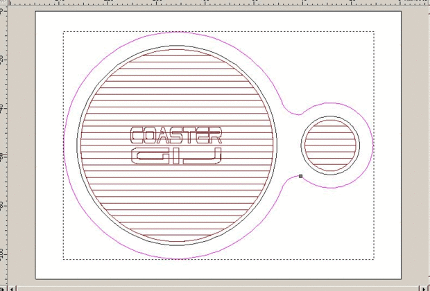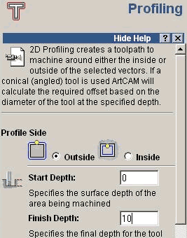 Se selecciona el vector exterior y la trayectoria de herramienta se crea para que la máquina se mueve a lo largo de la parte exterior del vector a una profundidad de 10mm a la montaña desde el bloque de acrílico.