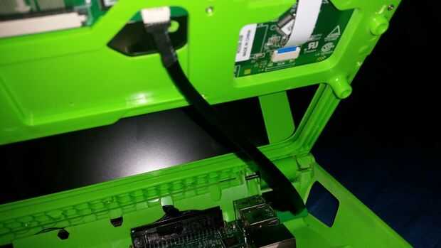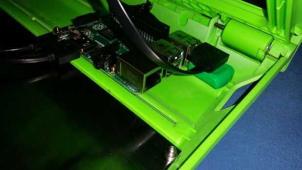 "slide" el teclado en la base como la pantalla en un paso anterior. Hay 2 formas de conectar el teclado. Levante un poco el tablero, o encaje en su lugar. Elegí este último. Enchufe el cable del botón en la última ranura en la parte posterior del módulo de eje. Luego conecte el cable USB en la parte superior trasera de salida de USB en el RPI. DESPUÉS de esto, coloque el teclado en su lugar.