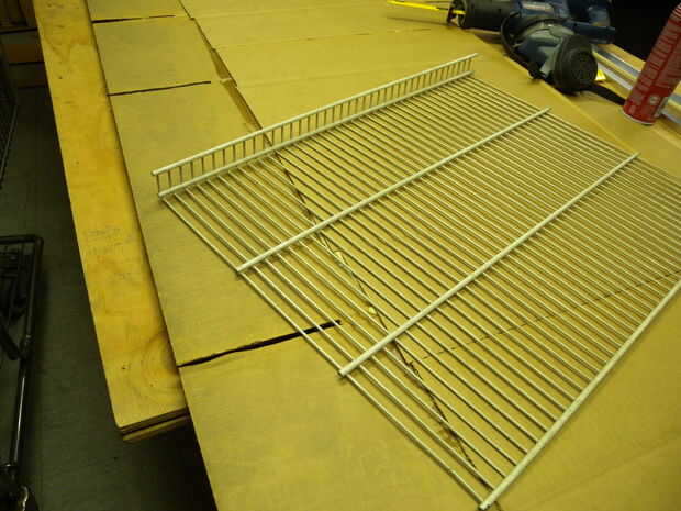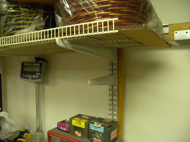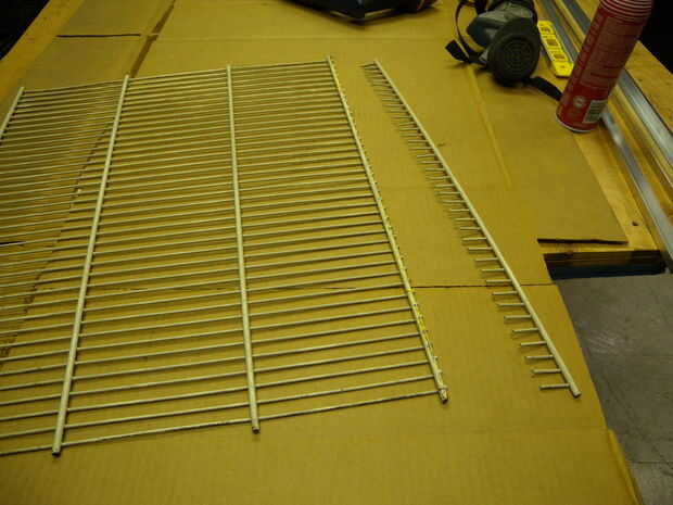 Necesitamos un dispositivo que nos permita tener opciones de ajuste de altura. Después de tratar de usar mi cerebro y creo que mi manera a través de él, dio para arriba y comenzó a subir a través de la basura en nuestro almacén. He encontrado un sistema de rack de metal blanco para colgar artículos en una pared. Corte el pedazo de 1 pulgada en el extremo con un Sierra, todo era plano. Entonces pintaba negro.