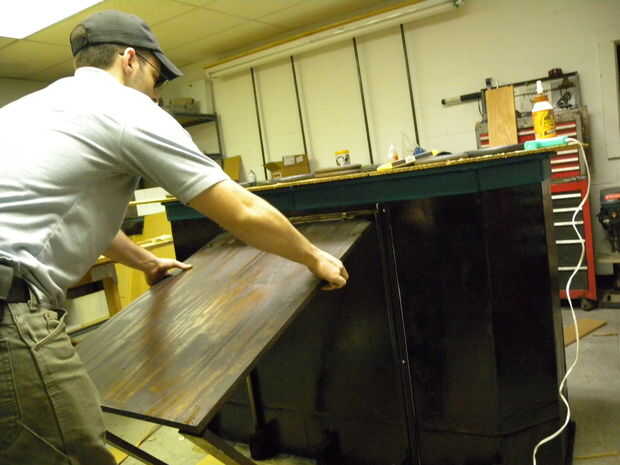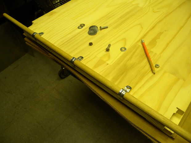 La tabla es de 24 pulgadas de ancho y unos 3 pies de largo. Una madera dowl se adjunta al final de la tabla. Este lado va a estar unida a la barra a través de los tubos del canal. La dote paseo en el interior de los tubos de arriba y abajo que permite ajuste de altura variable. Cada tubo está conectado a una pequeña franja de madera. Que pedazo de madera se perfora en la parte frontal de la barra en una pieza en la parte trasera... bastante mucho colocando la parte frontal de la barra. Le da un poco más de estructura de esa manera. Tres "dientes" son taladrados en el lado del pasador de la tabla. Estas piezas curvas de metal atrapa las rajas de la cosita de ajuste de altura variable y mantener en su lugar.