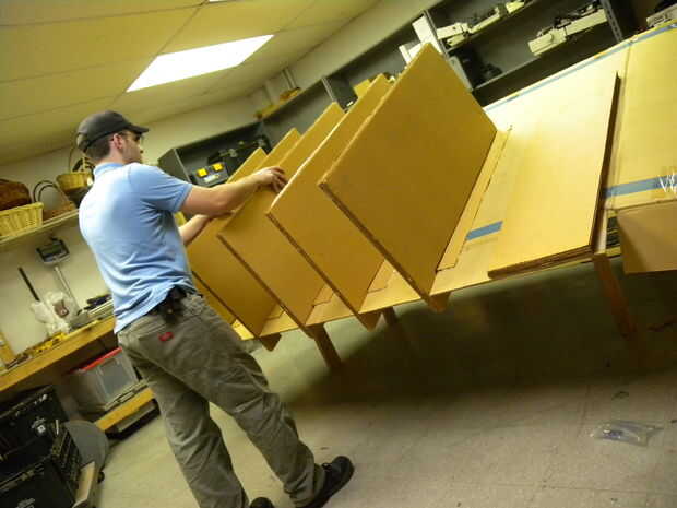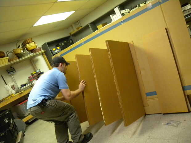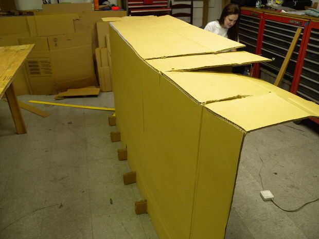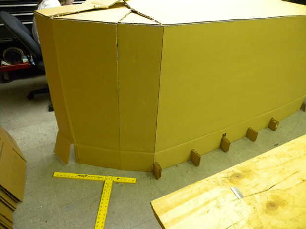 K) si la pieza delantera grande de cartón es como mayor de 38 pulgadas, anotar la capa exterior con un cúter. Cuidado de no ir a través de todo el camino. Que desea adjunta pero capaz de plegar en los pernos.
