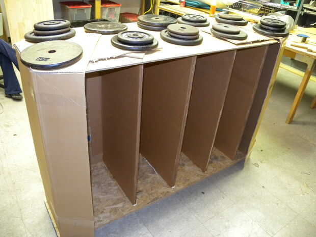 6) aplican los pesos como lo hizo antes con especial atención a mantener el peso en los postes de madera. EN esta foto tengo unas 200 libras total en la barra.
