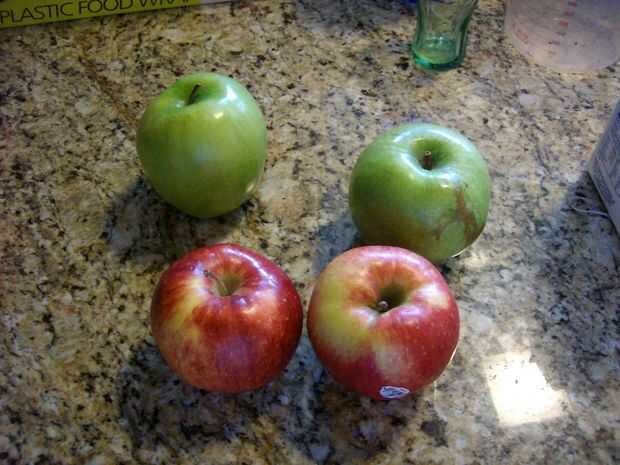 -4-5 tazas tarta de manzanas (combinación de Granny Smith y Jona oro buenas obras); Pelado, tubular y en rodajas - escasos 3/4 taza azúcar - escaso 1/4 taza de azúcar morena - 1 cucharadita de canela - 1 cda de jugo de limón - una pizca de sal - 1-2 cucharadas harina - 4 cucharadas de mantequilla, más un poco extra para el llenado de puntos