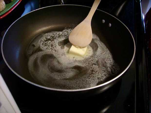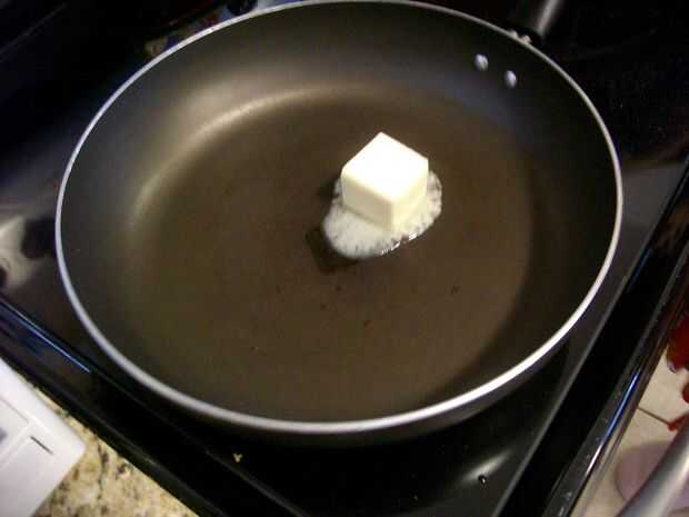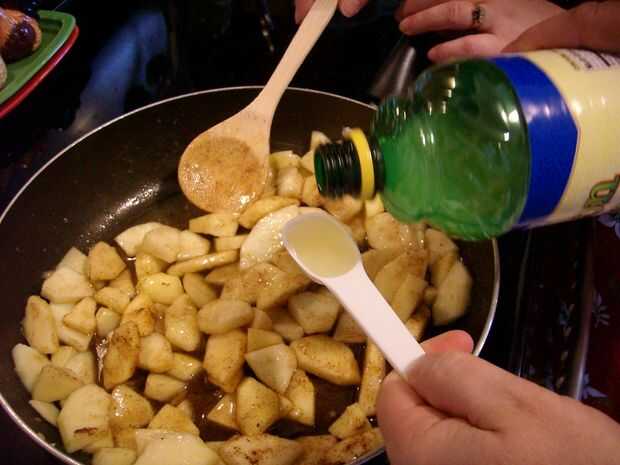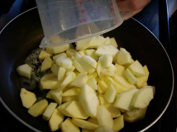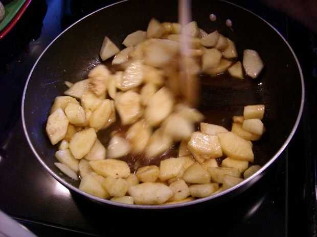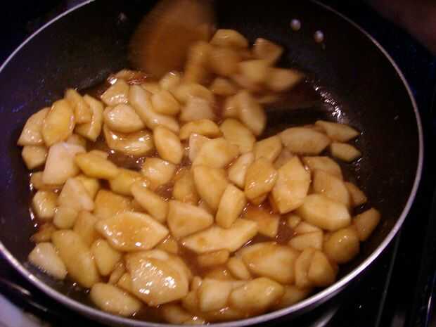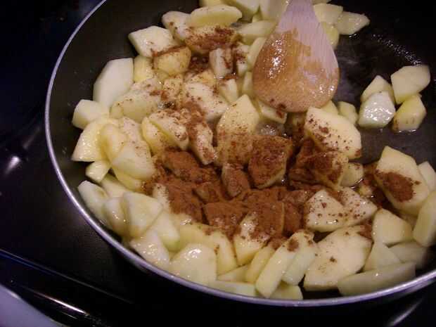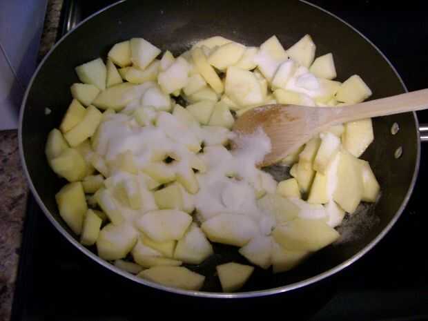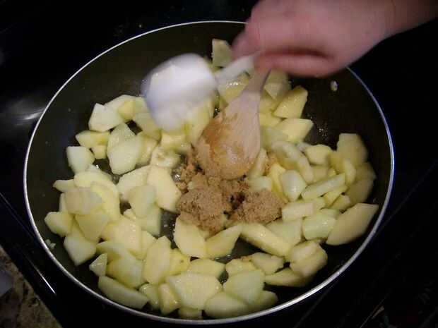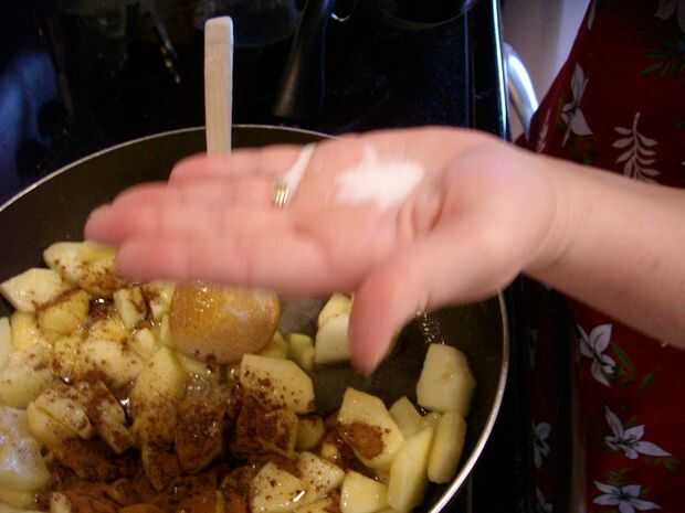 Derrite aproximadamente 4 cucharas de mantequilla en una sartén grande y agregar las rodajas de manzana.  Una vez que son uniformemente recubiertas añada los azúcares, sal canela y jugo de limón.  Revolver bien y dejar que las manzanas ablandar a fuego medio.