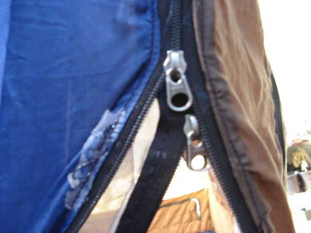 2. coser un borde de las cremalleras de cierre con cremallera para la puerta, luego cose el otro borde de la tienda. Cremalleras de ambos la pantalla y paño de puertas terminará siendo cosido el borde del marco de la puerta. Podría perno sólido y cremalleras de puertas juntas y coserlas en el borde del marco a la vez, pero me pareció más fácil hacerlo individualmente, y sospecho que usted también lo hará.