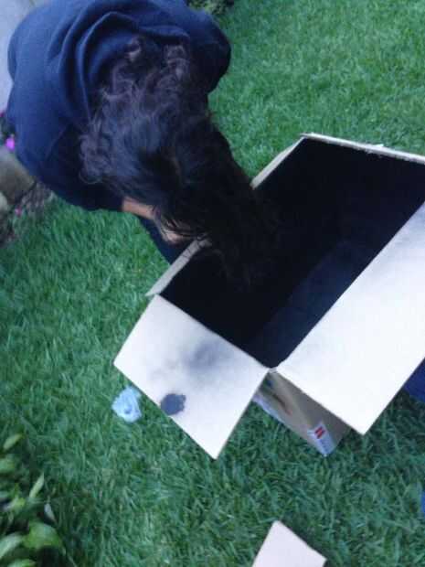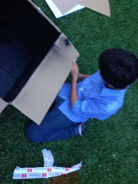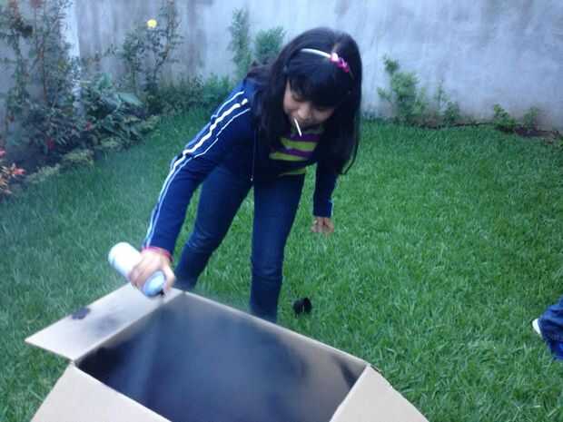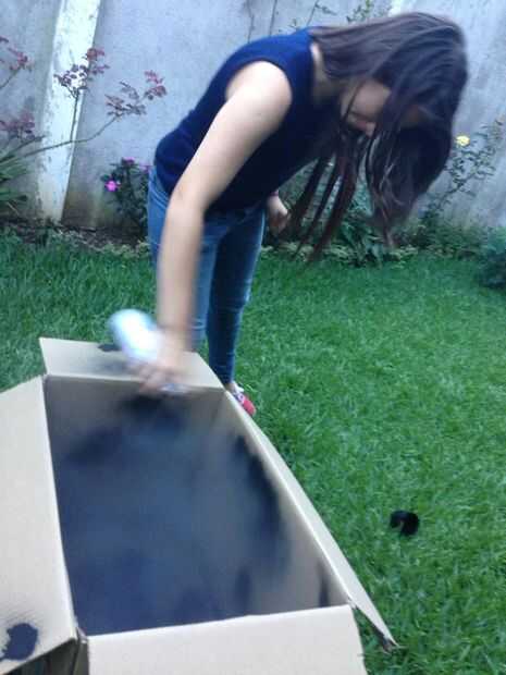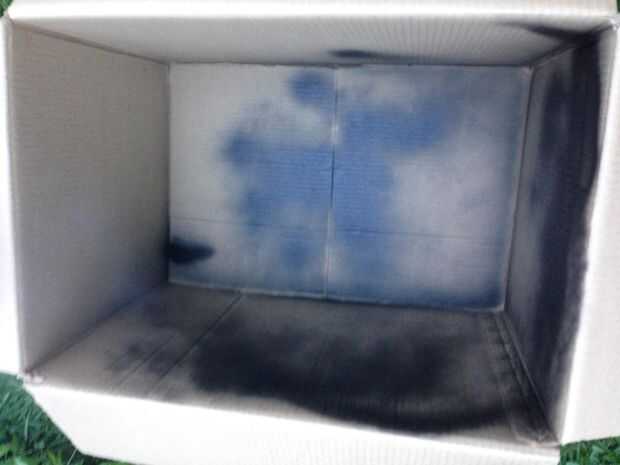 ahora corte 1 ventana 15cm de ancho y luego 30 cm de largo esta ventana es demasiado ven cómo funciona, luego se corta un pequeño cuadrado en el bottomof la caja 10 x 10, cortar un círculo en la parte superior de la caja, ahora la pintura con la pintura de aerosol de blak el interior de la caja .esperar para la pintura se seque como 25 minutos .meanwhile , corte un pice de plástico con las dimensiones de la ventana, luego pegar con la .now cinta aislante buscando una olla de barro que encaja dentro de la perforación de 10 x 10.