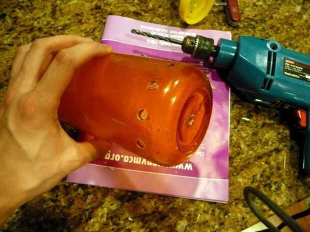 a continuación, perfore unos agujeros en la parte inferior de la botella. Se trata de que el agua entre en el filtro, para que pueda decidir sobre la cantidad, tamaño y posición de los agujeros. Que quieras estar fuera de la parte inferior no se bloqueado por el sustrato del tanque, pero no demasiado desde la zona entre los agujeros y el fondo es espacio esencialmente muerto (la piedra de aire extrae agua hacia arriba dentro de la botella.