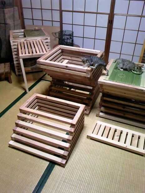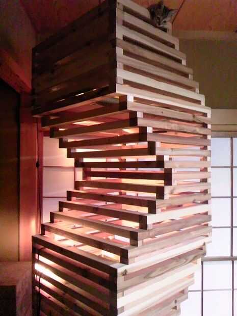 En general, la reutilización de la jaula es importante para reciclar medio ambiente. Reutilización de marco alto se considera en el diseño de esta torre del gato.