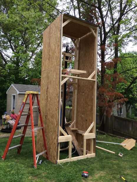 Después de que la base se enmarcó los marcos de la pared fueron Unidos. Una vez de pie, madera contrachapada fue cortada al tamaño de las paredes laterales y la parte delantera. El panel frontal fue sujetado en pero esperarán a los paneles laterales para más adelante.